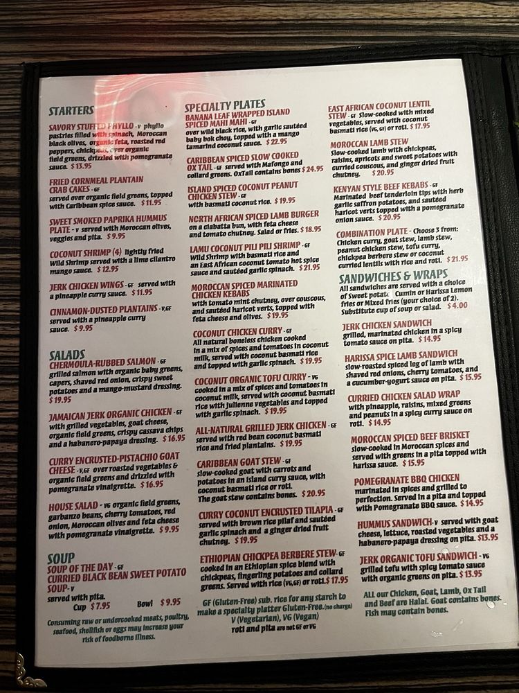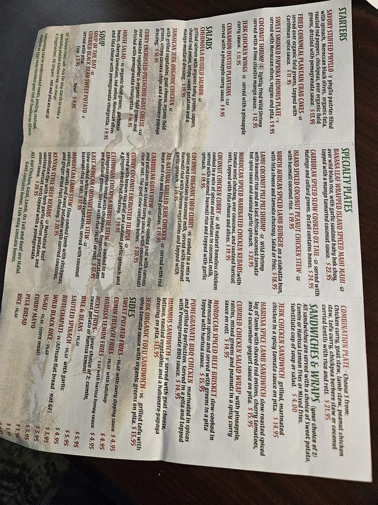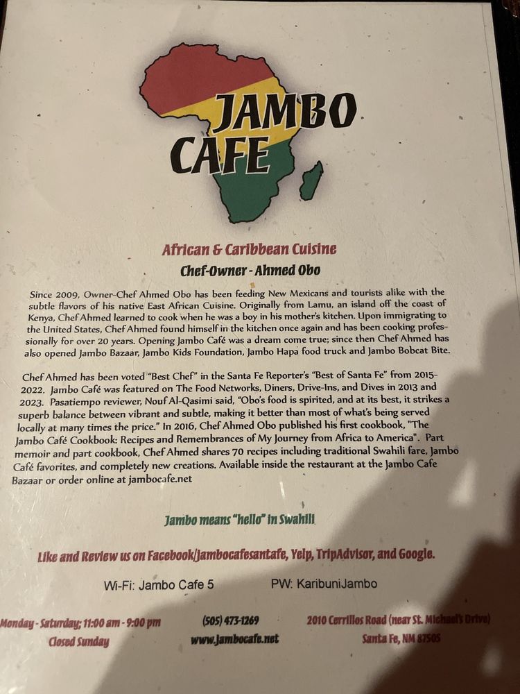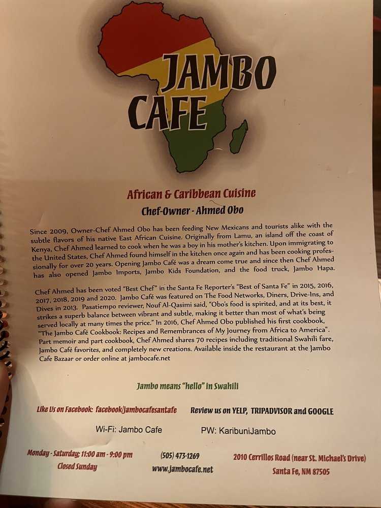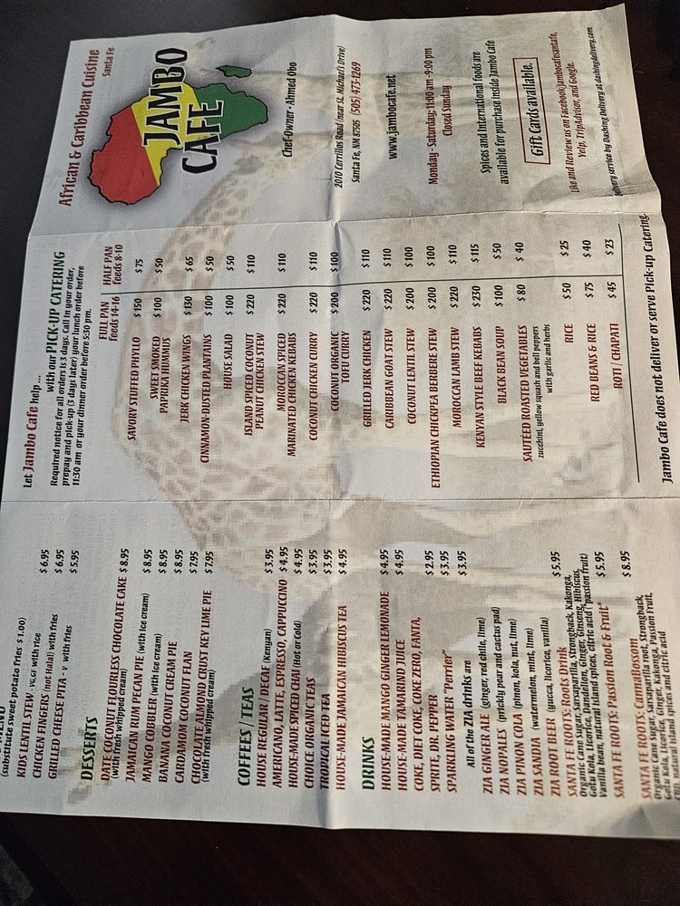 Introducing the menu at Jambo Cafe, a vibrant African-Caribbean restaurant in Santa Fe, NM. Offering a diverse range of options, from oxtail to sweet smoke paprika hummus, the flavors are both unique and delicious. Customers rave about dishes like the Kenyan style beef kebabs and Moroccan spiced beef brisket. With a focus on sustainability, the meat is grass-fed and halal. The menu also caters to pescatarians, vegetarians, and vegans with a variety of options. The ambiance is described as chill, with soft lighting, energizing music, and intriguing decor. Attentive staff and fast service enhance the dining experience. Whether you're in the mood for a flavorful burger, coconut chicken curry, or cinnamon-dusted plantains, Jambo Cafe is a must-try for those seeking unique and delightful flavors.