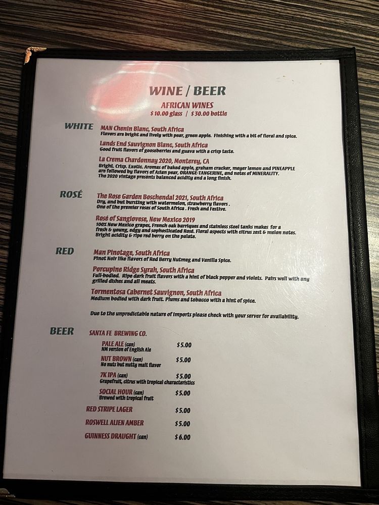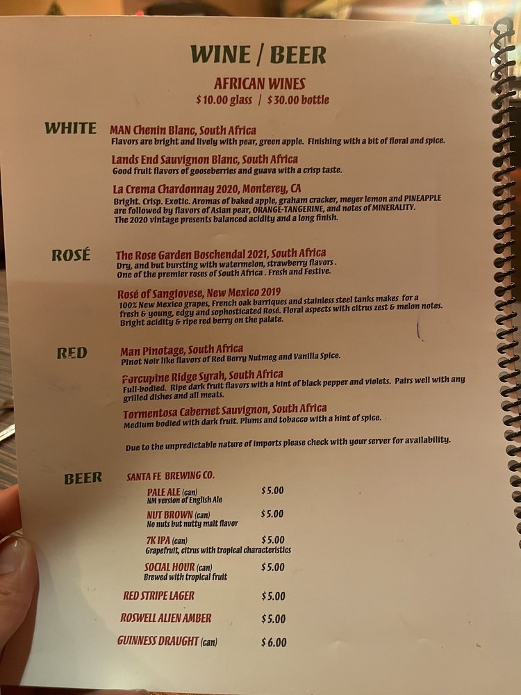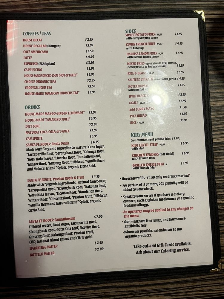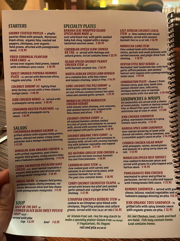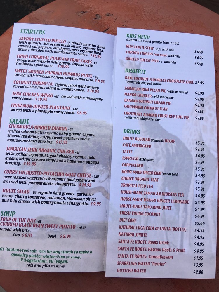 Introducing the menu at Jambo Cafe, a vibrant African-Caribbean restaurant in Santa Fe, NM. Offering a diverse range of options, from oxtail to sweet smoke paprika hummus, the flavors are both unique and delicious. Customers rave about dishes like the Kenyan style beef kebabs and Moroccan spiced beef brisket. With a focus on sustainability, the meat is grass-fed and halal. The menu also caters to pescatarians, vegetarians, and vegans with a variety of options. The ambiance is described as chill, with soft lighting, energizing music, and intriguing decor. Attentive staff and fast service enhance the dining experience. Whether you're in the mood for a flavorful burger, coconut chicken curry, or cinnamon-dusted plantains, Jambo Cafe is a must-try for those seeking unique and delightful flavors.